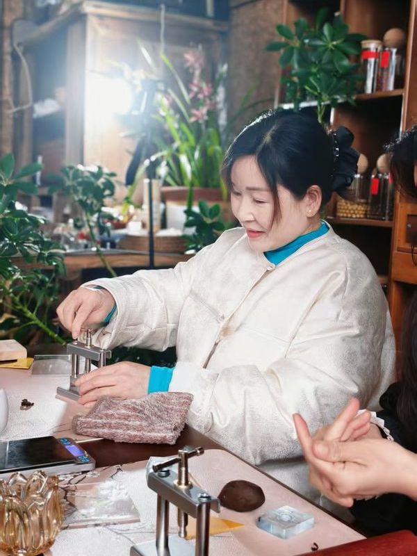 朋友们小心翼翼地加水调泥,在一次次将香泥压进模具,见证香粉蜕变为香珠、香牌……
